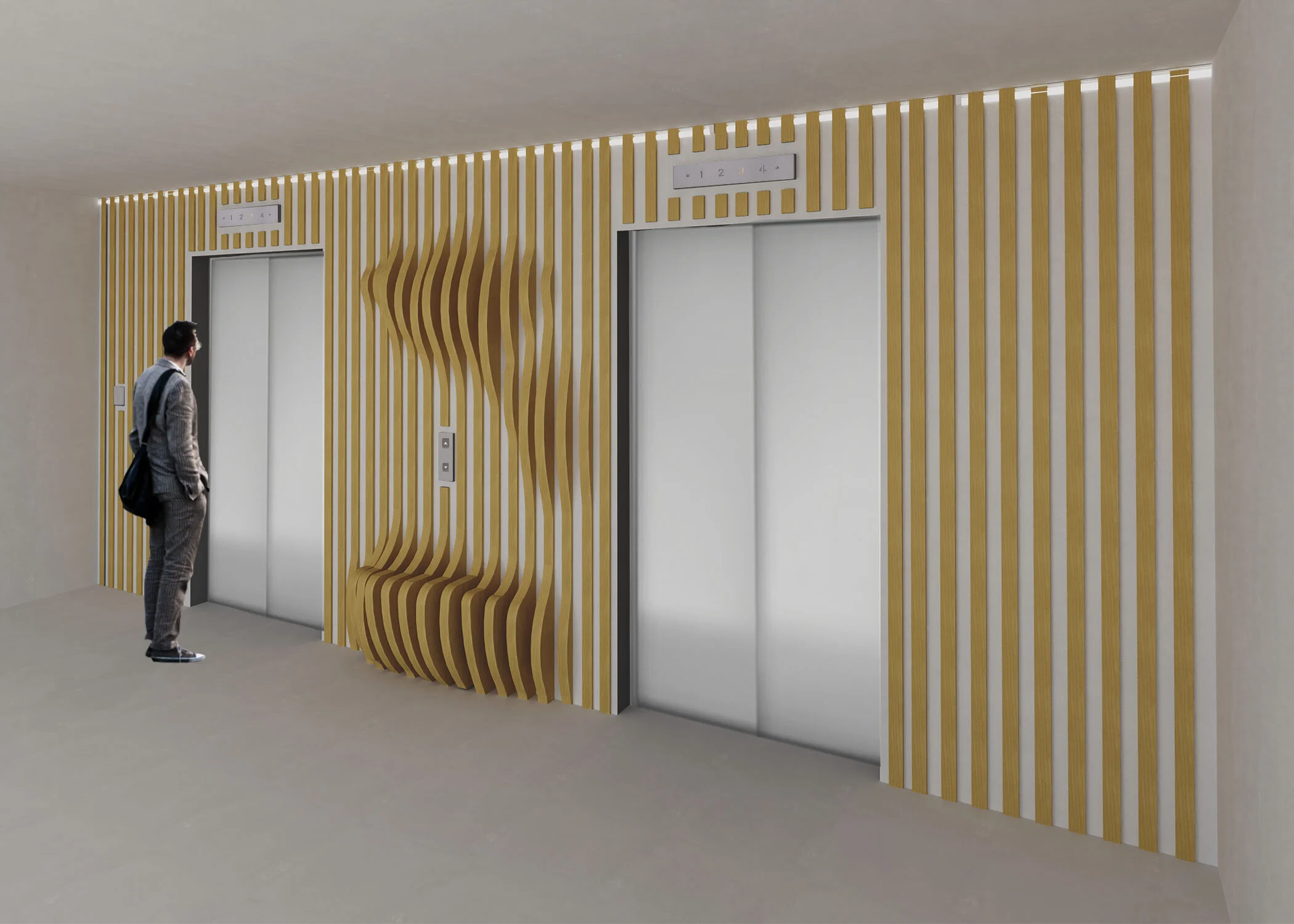 Conceptual Revit Model produced to experiment with waves on a Millwork feature wall in an office space setting. Multiple Iterations show the progression of the curved wooden slates to create the most accurate ‘bubble-like’ effect.
